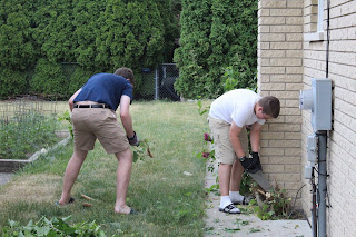 There is a white mulberry bush/tree right outside the kitchen window. Each spring we cut it back to the roots and in a short few weeks it is partially blocking the window again. The boys took out the saws and machetes and hacked away, while they were at it, they trimmed the rose bush on the side of the house as well. It will certainly make it easier to move the lawn...