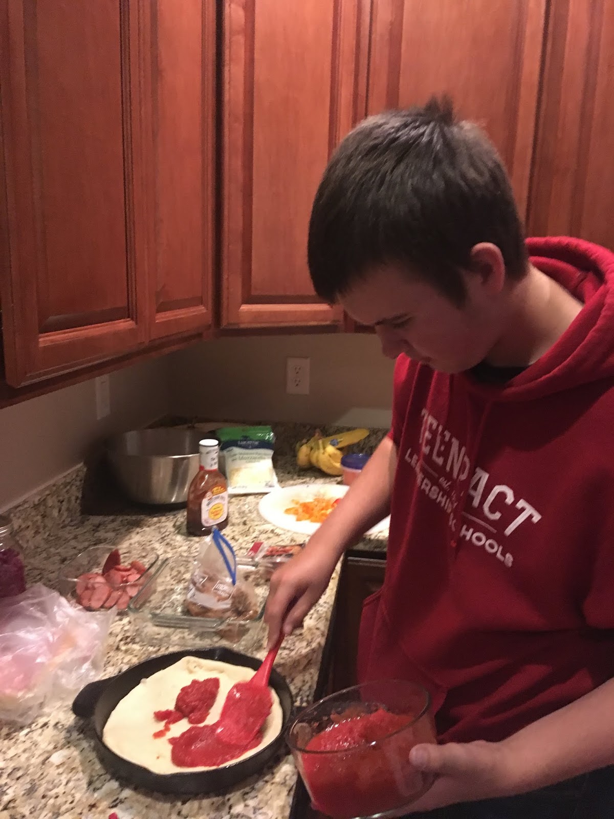 Friday tradition continues. Noah is mastering tossing the dough. Bob prefers the rolling pin, and Lukas uses his hands to flatten out the dough in the cast-iron pan.